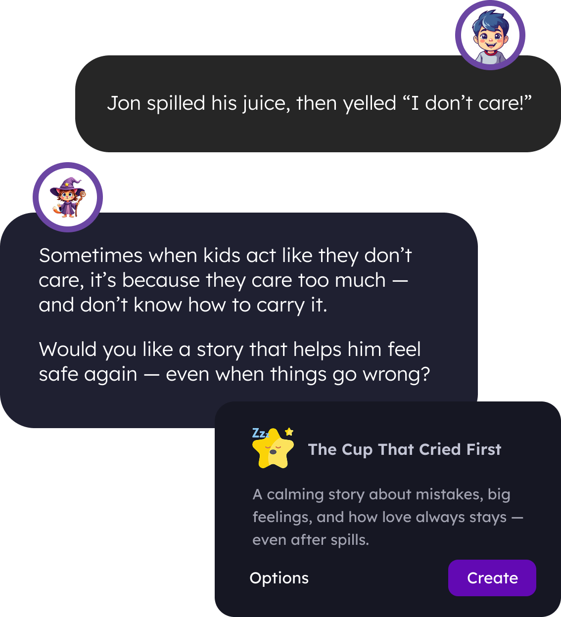 Telluna reflects those feelings back to you — often in ways that surprise you — and suggests a story that speaks directly to your child’s emotional world.